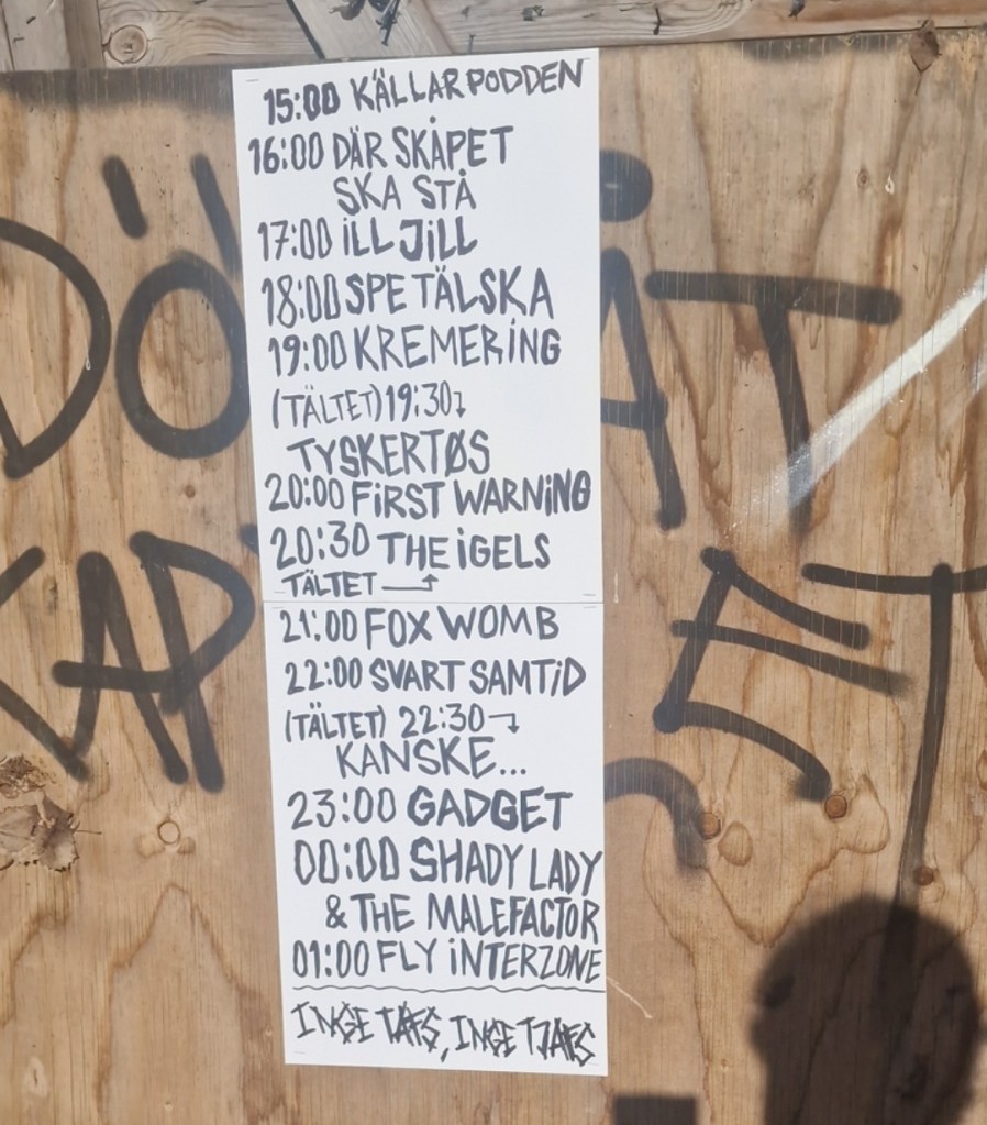 Redan dag 1 träffade jag Punk-Ove och Punk-Anna som var där för att spela med Där skåpet ska stå som alltså inledde dag 2. Punk-Ove och Punk-Anna är mina punklärare från Högstadiet. jag ska förklara det här för er som är yngre, när det inte fanns sociala medier eller ens youtube, fick man helt enkelt åka hem till en äldre punkare i trakten där man bodde och “Hej jag är intresserad av Punk, vad behöver jag höra? Jag har hört Asta, Strebers och KSMB”, och då visar till exempel Punk-Ove Subhumans, Crass, Mob 47, Discharge osv och sen är man liksom igång. Alla föräldrar därute, vad skulle vara konstigt med att ens tonåring plötsligt börjar umgås med tio år äldre personer som har konstiga kläder och frisyrer? Tänkte väl det. Inget!